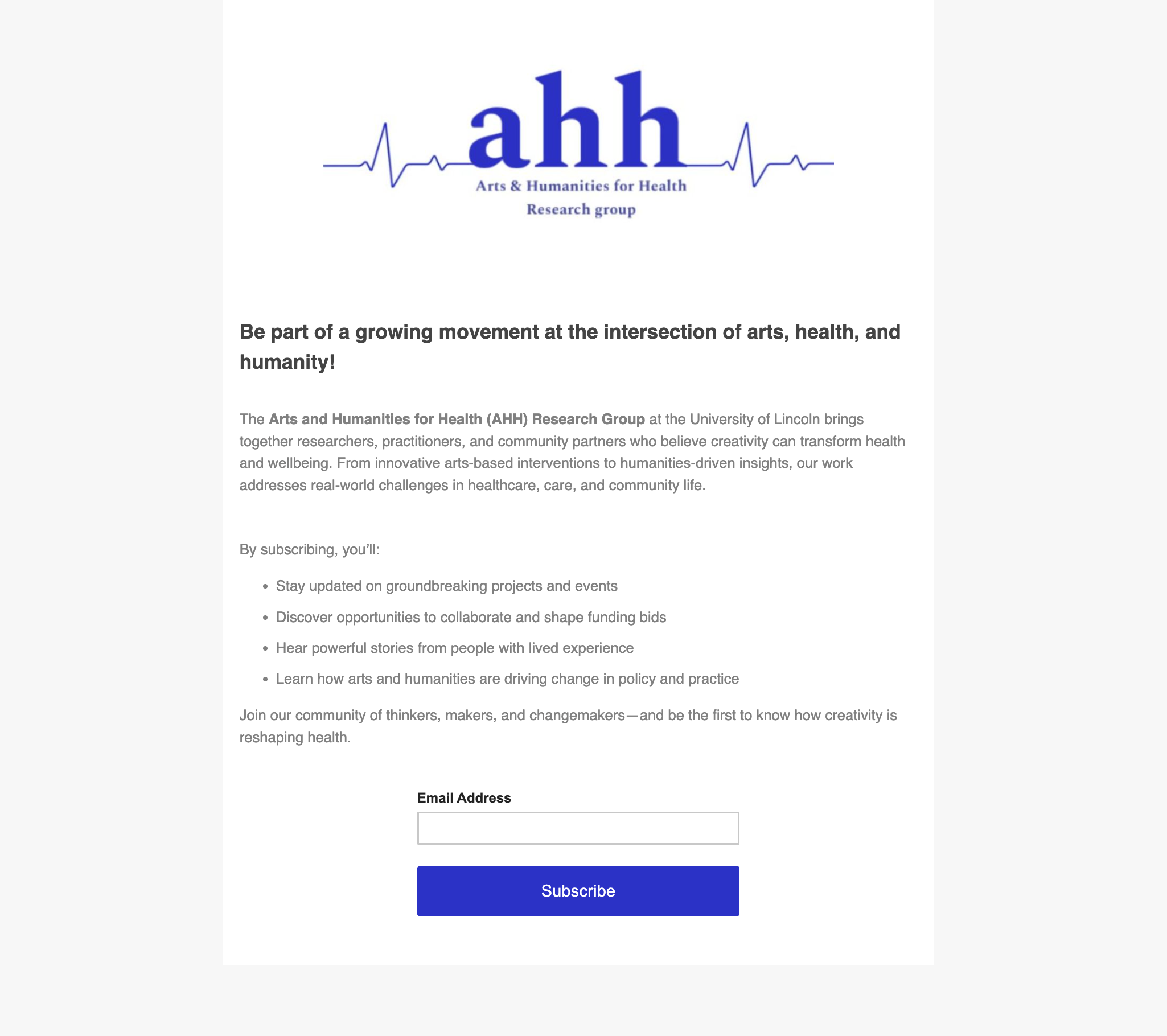 Subscribe to stay updated on groundbreaking projects and events, discover opportunities to collaborate and shape funding bids, hear powerful stories from people with lived experience, and learn how arts and humanities are driving change in policy and practice. Join our community and be the first to know how creativity is reshaping health.