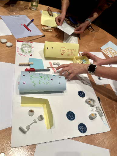 Following this discussion, participants were invited to translate these ideas into a more tangible and imaginative form through another creative activity. Using a range of materials, including clay, groups were asked to construct their ideal version of a library as a civic space, incorporating the many ideas generated on day one. The session took on a playful, world-building quality, encouraging participants to move beyond existing institutional constraints and instead imagine what a library designed to support young people’s digital wellbeing could be.
