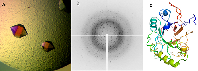 We have a multi-disciplinary approach to answering fundamental questions relating to the characterisation, evaluation and testing of microorganisms and viruses. This could be for example, investigating the activity of new antimicrobials or defining the structure of bacterial proteins. Structural biology is an important tool we use to investigate the 3-D structures of biomolecules and explain biological interactions. The figure below shows some of the key steps for an X-ray crystallographic study used to solve the protein structure of a bacterial cell wall “re- structuring” enzyme from Bacillus anthracis. (a) X-ray diffraction pattern (b) and (c) structure of the “re- structuring” enzyme known as an autolysin.